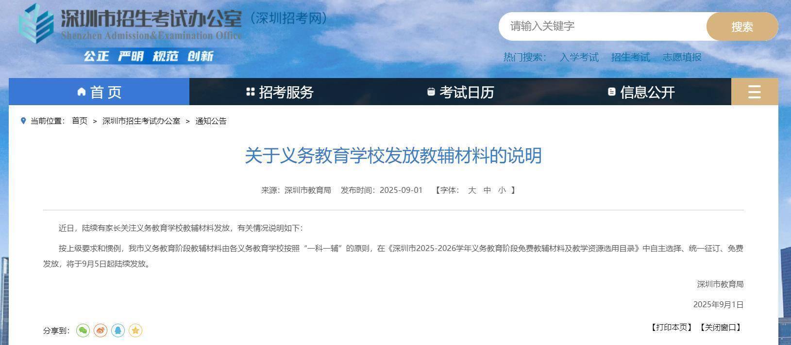 9月1日中午,深圳市教育局对此回应:深圳义务教育阶段教辅材料由各校按“一科一辅”原则,在《深圳市2025-2026学年义务教育阶段免费教辅材料及教学资源选用目录》中自主选择、统一征订、免费发放,9月5日起将陆续发放。(据9月1日深圳新闻网报道)
